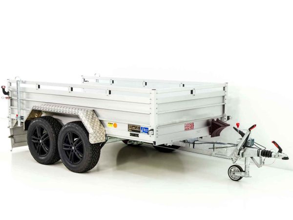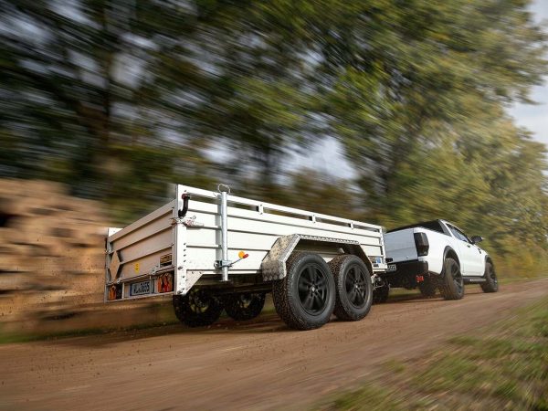 Przyczepa Koch „CROSSLINE” – lekka, a jednocześnie bardzo wytrzymała. Wysokość burty 60 cm, ładowność 2190 kg, DMC 2600 kg. Aluminiowa podłoga zapewnia niską masę własną i dużą wytrzymałość. Koła 215/65 R16 na czarnych alufelgach, amortyzatory i reflektory pozycyjne gwarantują bezpieczeństwo.
